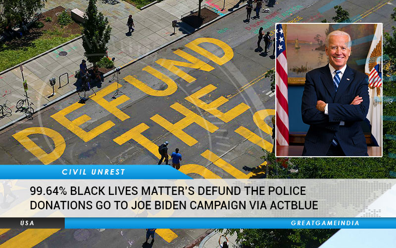 (GreatGameIndia) Joe Biden, the presumptive presidential candidate for the United States 2020 election has declared that he does not support the call for defunding the police. Meanwhile, in an investigation it has been found that 99.64% of the Black Lives Matter’s ‘Defund the Police’ donations go to Joe Biden via ActBlue, a Democrat fundraising platform that is the top donor to Biden for President campaign.