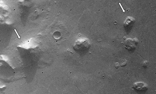 New images from Cydonia also appear to support the Cydonian Hypothesis. An area of the D&M (DiPietro and Molenaar) Pyramid (left arrow), which is near the Cydonian Face (right arrow), shows what appears to be a square doorway.