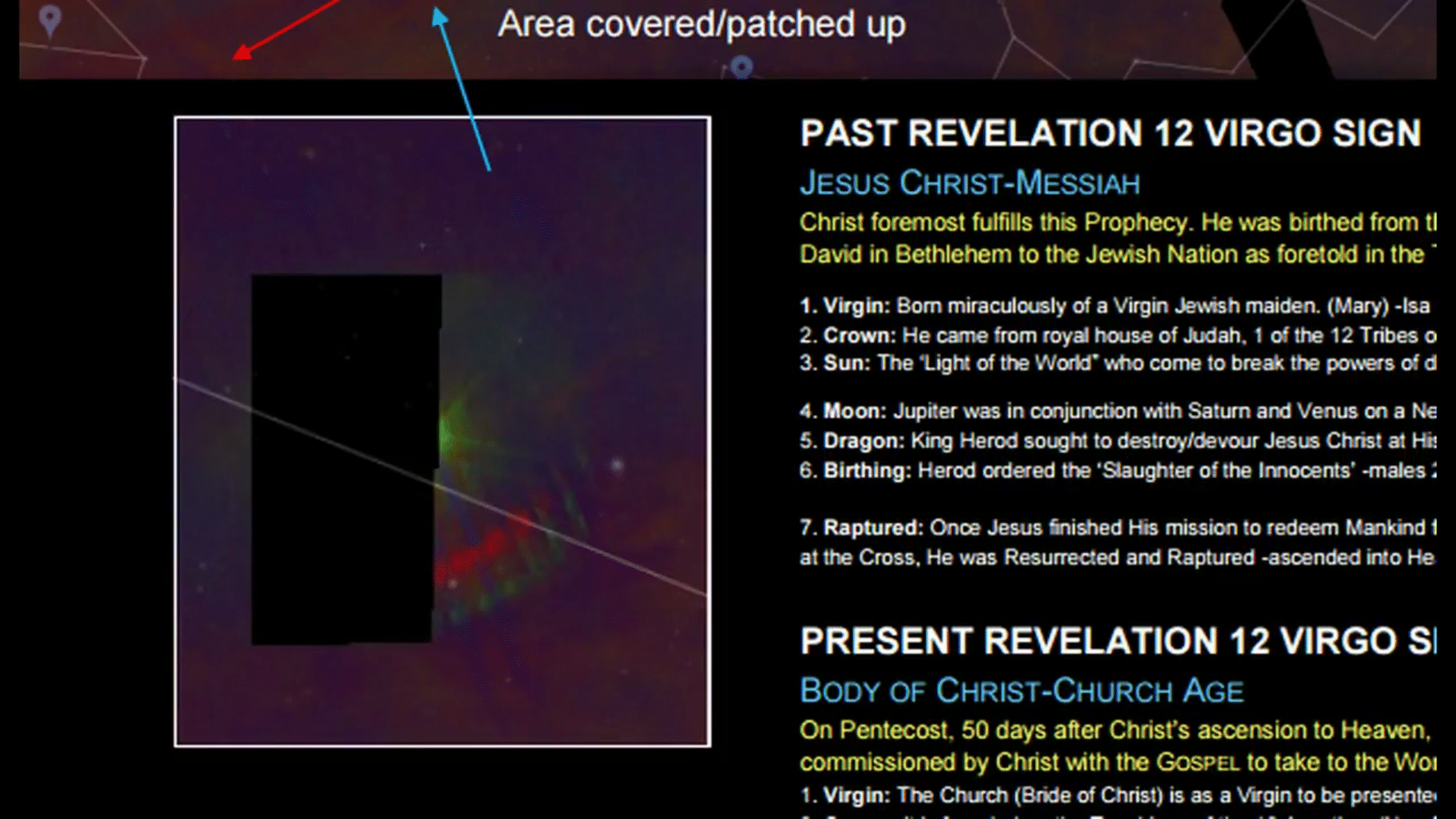 On similar space viewing platforms, researchers found the same black boxes obfuscating a part of the constellation Virgo. Finally Google uncovered the box in Google Sky, and this image was produced. It became known as the Red Dragon, which corresponds to a part of the biblical Book of Revelation.