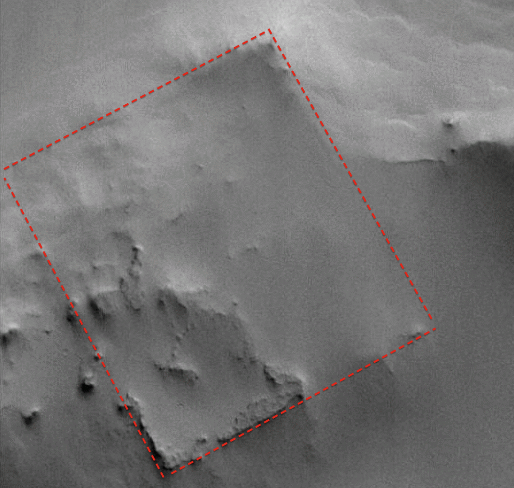 An image taken by the Global Mars Surveyor mission allegedly depicts giant rectangular shaped structures, buried deep below the surface of Mars. The square pattern supposedly depicts yet another site in ruins on the surface of Mars.