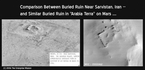 The images taken by the Mars Global Surveyor is considered by many as another obvious sand-covered artificial ruin on the surface of the red planet found at the following coordinates: located at 28.38° N., 332.54° W., in a region called (appropriately) “Arabia Terra“.