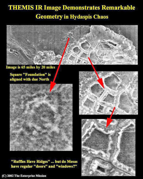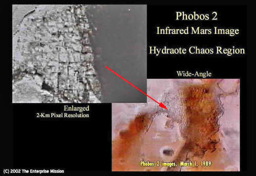 In 2002 NASA’s Mars Odyssey Mission captured the first first nighttime IR “test” images of the red planet revealing what many refer to as ‘A Buried Maritan City.’ The data beamed back by the Odyssey mission apparently reveals yet another set of incredible geometric structures on the surface of Mars, a region located beside the Soviet Phobos 2 images — in “Hydaspsis Chaos” (2° North/ 29° West).