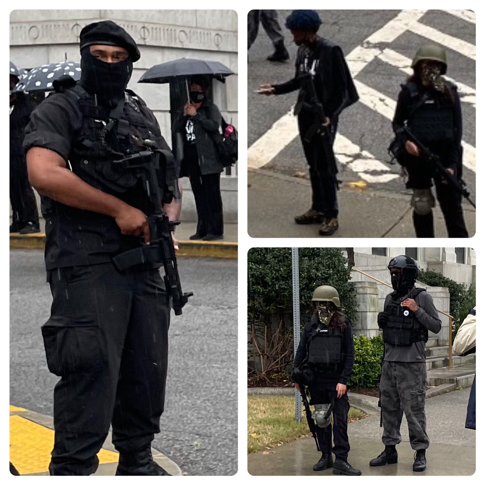 Masked, helmeted private militia carrying AK47s and AR15s showed up today at the State Capitol. You have not heard about it because the gunmen are radical leftists. Imagine the news coverage if one of them was wearing a MAGA cap. pic.twitter.com/4dEatissEk