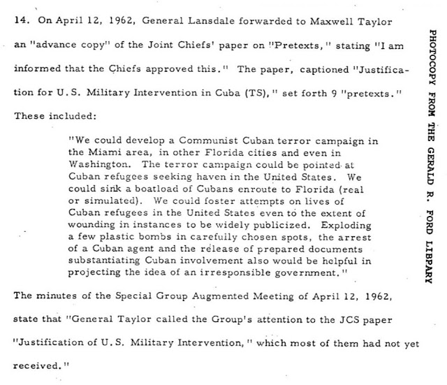 “We could develop a Communist Cuban terror campaign in the Miami area, in other Florida cities and even in Washington. The terror campaign could be pointed at Cuban refugees seeking haven in the United States. We could sink a boatload of Cubans enroute to Florida (real or simulated),” the document reads.