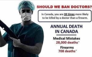 People there are asking if doctors should be banned because in Canada, you are 39 times more likely to be killed by a doctor than a firearm.