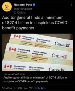 In Canada Auditor General Karen Hogan says $32 billion of the federal government’s COVID-19 relief payments went to people who have not been able to prove they were qualified.