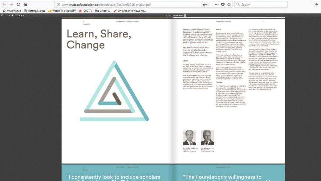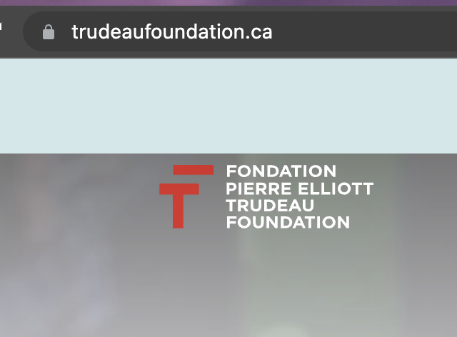 Stillness in the Storm Editor: I fact-checked the above image and found the following, which shows the web address at the top, clearly the Trudeau Foundation. This is not the logo, however. The logo of the foundation is a stylized red T.