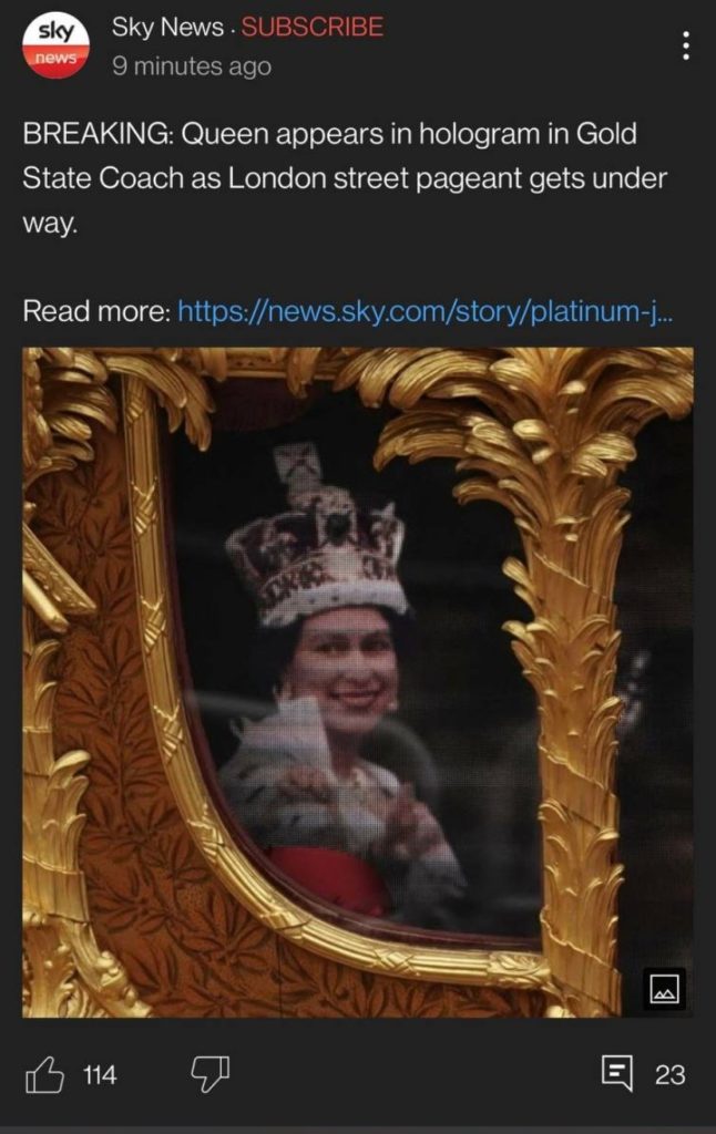 In what appears to be her contribution to the project blue beam celebration of the start of a new Golden Age, she time traveled back 70 years by appearing as a hologram in the ancient British Royal Carriage.