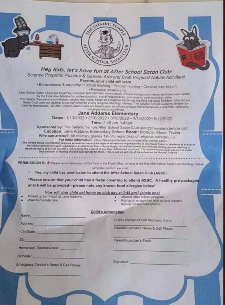 Then we have an Elementary School in Illinois is passing out flyers promoting an “After School Satan Club”