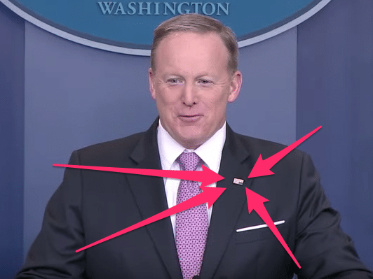 Image Source. Sean Spicer’s US flag lapel pin upside down.
