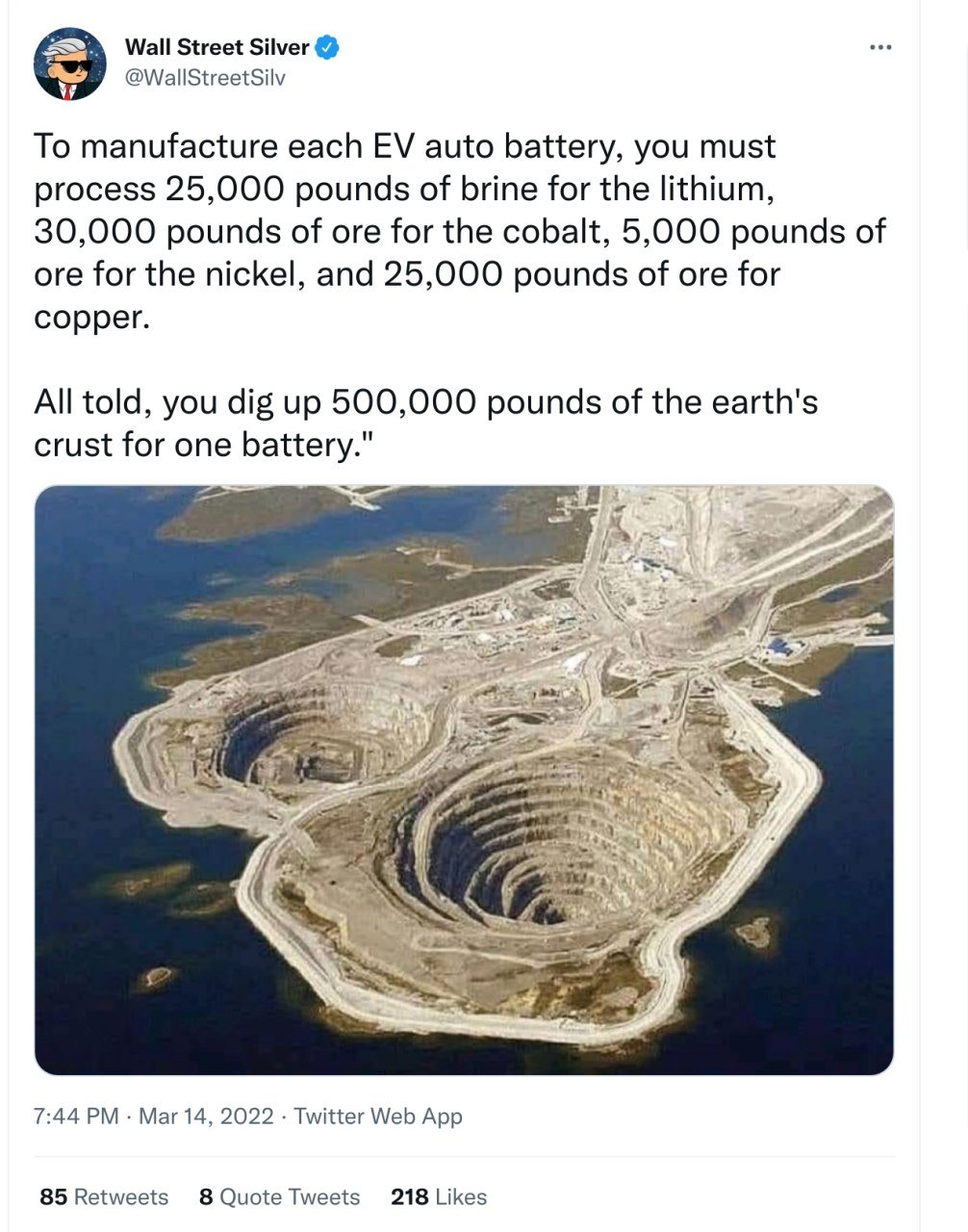 The dark side is trying to stop this by killing 90% of humanity and destroying much of the natural world. In other words they are planning ecocide as well as genocide. An example is the push to convert the worlds’ automobile fleet into so-called “eco-friendly” electric motors. To do this, you must dig up 500,000 pounds of the earth’s crust for ONE battery.