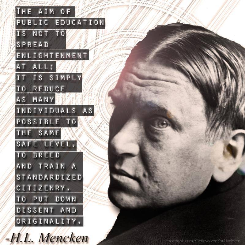 “The aim of public education is not to spread enlightenment at all; it is simply to reduce as many individuals as possible to the same safe level, to breed a standard citizenry, to put down dissent and originality.”