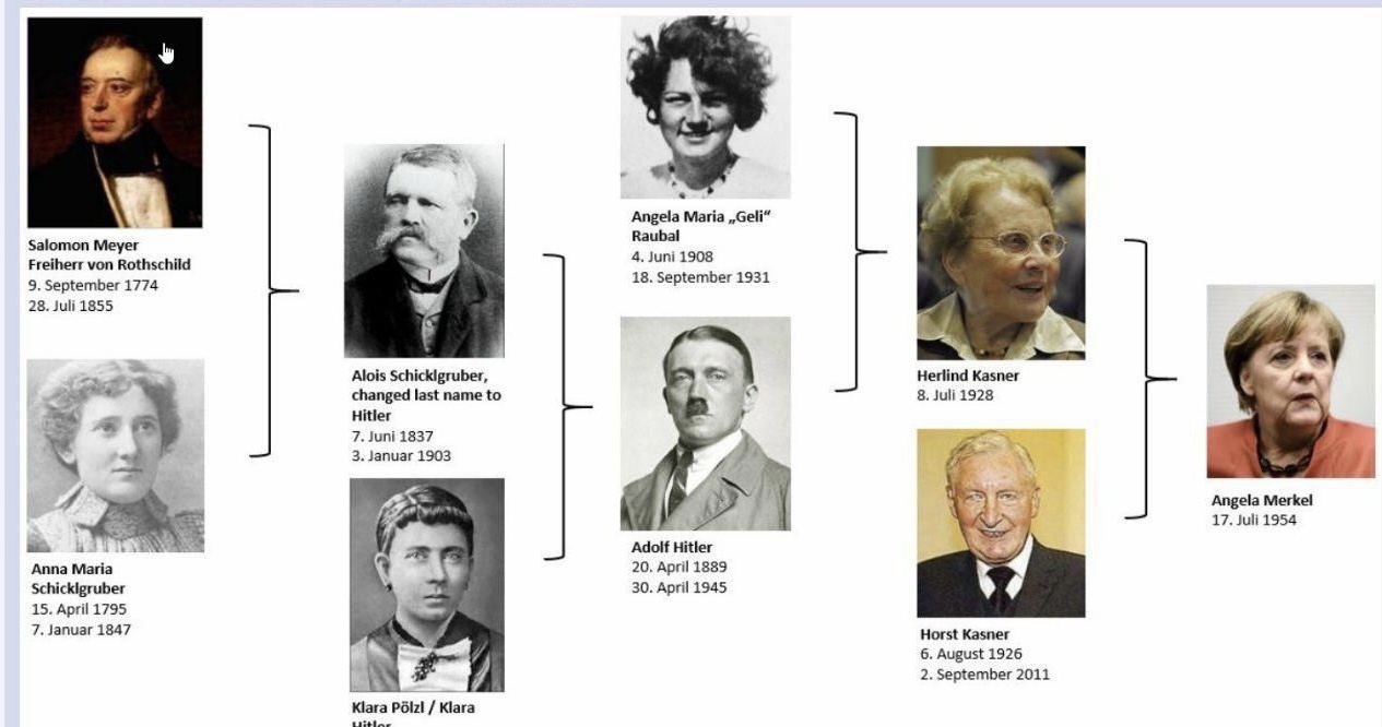 The resignation of German Chancellor Angela Hitler has removed the last major protection these criminals had. To enlighten those who still do not know why we call her Hitler, Mossad has provided us with their analysis of her genealogy.