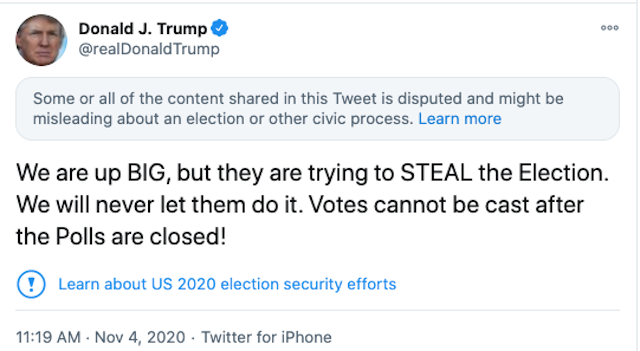 Twitter has taken it upon itself to place “disclaimers” under almost all tweets by @realdonaldtrump about the election—showing the bias and political nature of the social media giant.