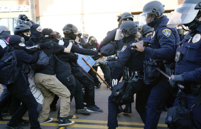 Three protesters were arrested and the San Diego Police Department said it would release details on the arrests on Monday.