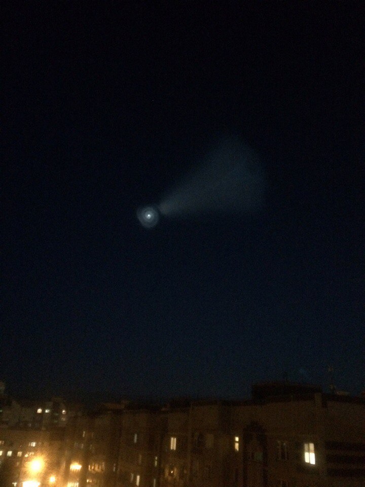 “The mysterious spiraling glow was produced by the launch of the intercontinental ballistic missile RS-12M Topol from Kapustin Yar to test an advanced version of warheads. The warhead hit the designated target at the Sary-Shagan testing range in Kazakhstan.”