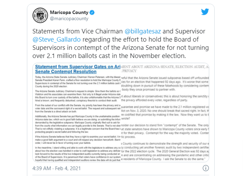 Statements from Vice Chairman @billgatesaz and Supervisor @Steve_Gallardo regarding the effort to hold the Board of Supervisors in contempt of the Arizona Senate for not turning over 2.1 million ballots cast in the November election. pic.twitter.com/hhB7uq0RAh