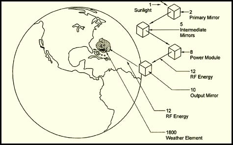 [Image: From a February 2006 patent application by Solaren, proposing that terrestrial weather systems might be controlled by mirrors in space].