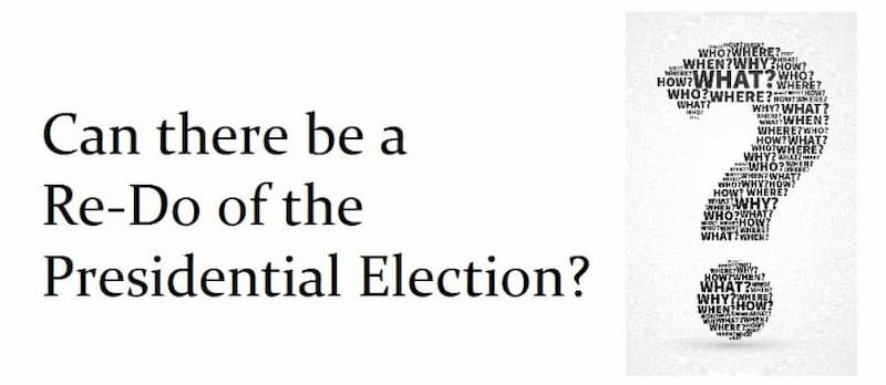 The Constitution does not have any process for a do-over. Interestingly, the judiciary does have the power to order new elections for offices but never in the case if a president. Such decrees have come in the face of a proven case of fraud or error or gerrymandering. In 2019, North Carolina courts ordered the legislature to draw fairer election districts, holding out the potential for voters — not lawmakers — to decide which party would control the General Assembly. A Senate election was once redone in New Hampshire because it was too close to determine even with multiple recounts. So, there is some precedent that in the face of fraud or elections to be too close to count, the Judiciary has stepped in.