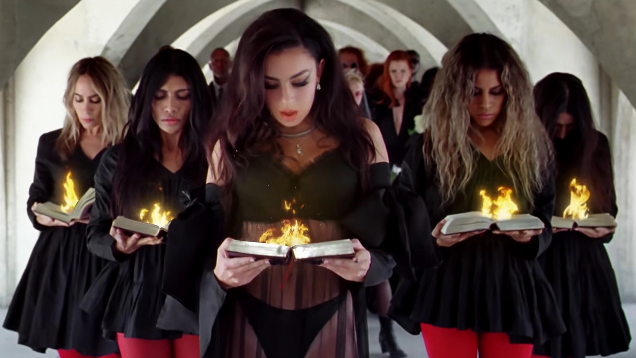 While everybody’s wearing black, Charli and her girls also wear red – the color occultly associated with initiation and blood sacrifice. They’re holding burning Bibles, an image that sums up the satanic subtext of this video.