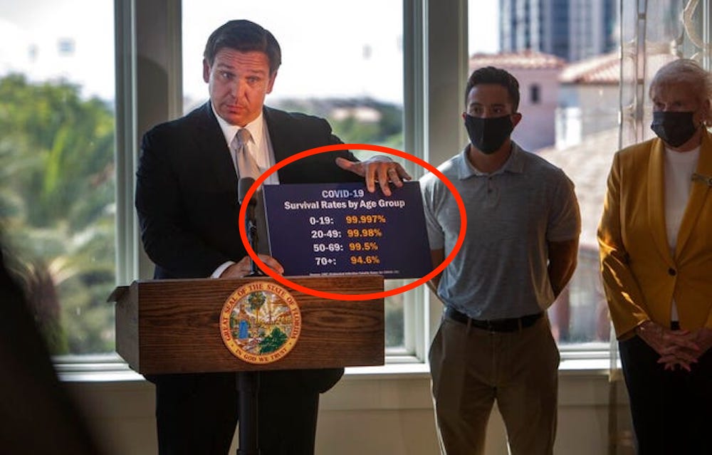 (Arjun Walia) Florida Governor Ron DeSantis recently lifted all restrictions on restaurants and other business in Florida and banned local fines against people who refuse to wear masks. He did so after showing new statistics just released by the Centers for Disease Control (CDC) showing very high survival rates, as you can see from the picture picture above. The CDC has a page on their website titled “Covid-19 Pandemic Planning Scenarios.” According to them, “Each scenario is based on a set of numerical values for biological and epidemiological characteristics of COVID-19 illness, which is caused by the SARS-CoV-2 virus. These values—called parameter values—can be used in models to estimate the possible effects of COVID-19 in U.S. states and localities. That’s where the numbers come from.