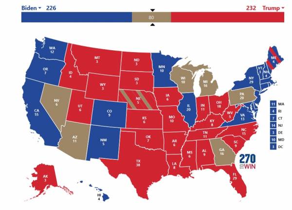 The President now holds 232 EC votes to Biden’s 226. The President has won 25 states to Biden’s 19. There are 6 states still in question.