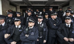 | FacebookTwitterPinterest Police form a cordon around the Grand Connaught Rooms as protesters gather. Photograph: Rex/Shutterstock |