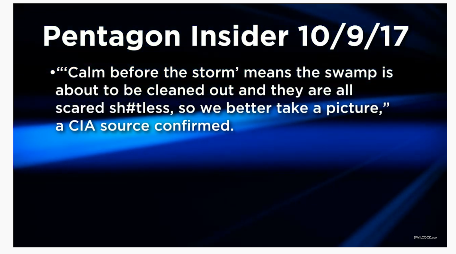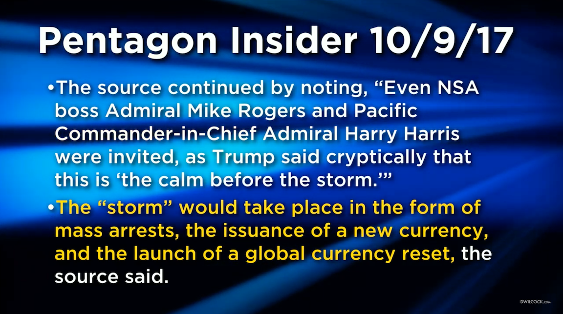 For those of us who have a particular interest in the Global Currency Reset aspect of this Operation Freedom, David verifies that is one of the essential elements of the shift. David reports that on 10-9-17, a Pentagon Insider explained that the “storm” would be mass arrests, the issuance of a new currency, and the launch of a global currency reset.”