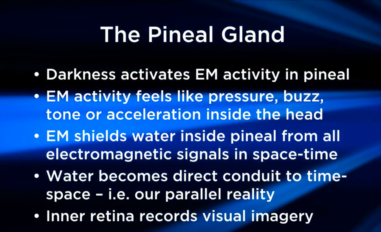 4:22 It’s in the middle of your brain, kind of upside down, in the geometric center of the brain, and the ear drums are aligned in a tetrahedral shape… apparently when people really know how to activate the pineal gland, which is what’s going to happen to all of us… part of this great awakening… the whole planet’s consciousness changes… so the pineal gland… you can create a stargate to shoot through to get to somewhere else…