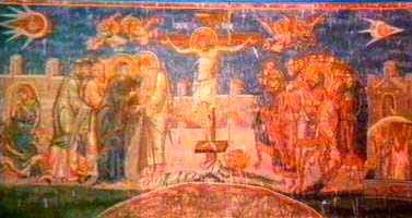 Frescos throughout Europe which reveal the appearance of space ships in the skies including this painting of ‘The Crucifixion’ – painted in 1350. It seems to depict a small human looking man looking over his shoulder – at another UFO as if in pursuit – as he flies across the sky in what is clearly a space ship. The leading craft is decorated with two twinkling stars, one reminiscent of national insignia on modern aircraft. This painting hangs above the altar at the Visoki Decani Monestary in Kosovo, Yugoslavia.