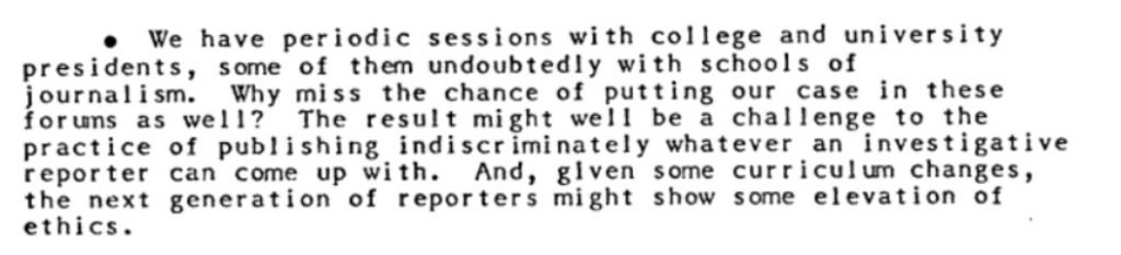 Another document, relating to the same one discussed above shows an initiative to “call in media leaders,” whatever that means, and a system for screen disclosures by the media, and also mentions “centralized control of all press contacts,” as well as “control of press access.”