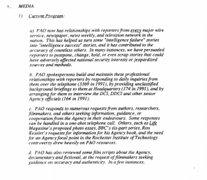 The document states that the CIA task force “now has relationships with reporters from every major wire service, newspaper, news weekly, and television network in the nation,” and that “this has helped us turn some ‘intelligence failure’ stories into ‘intelligence success stories,’ and has contributed to the accuracy of countless others.” Furthermore, it explains how the agency has “persuaded reporters to postpone, change, hold, or even scrap stories that could have adversely affected national security interests or jeopardized sources and methods.”
