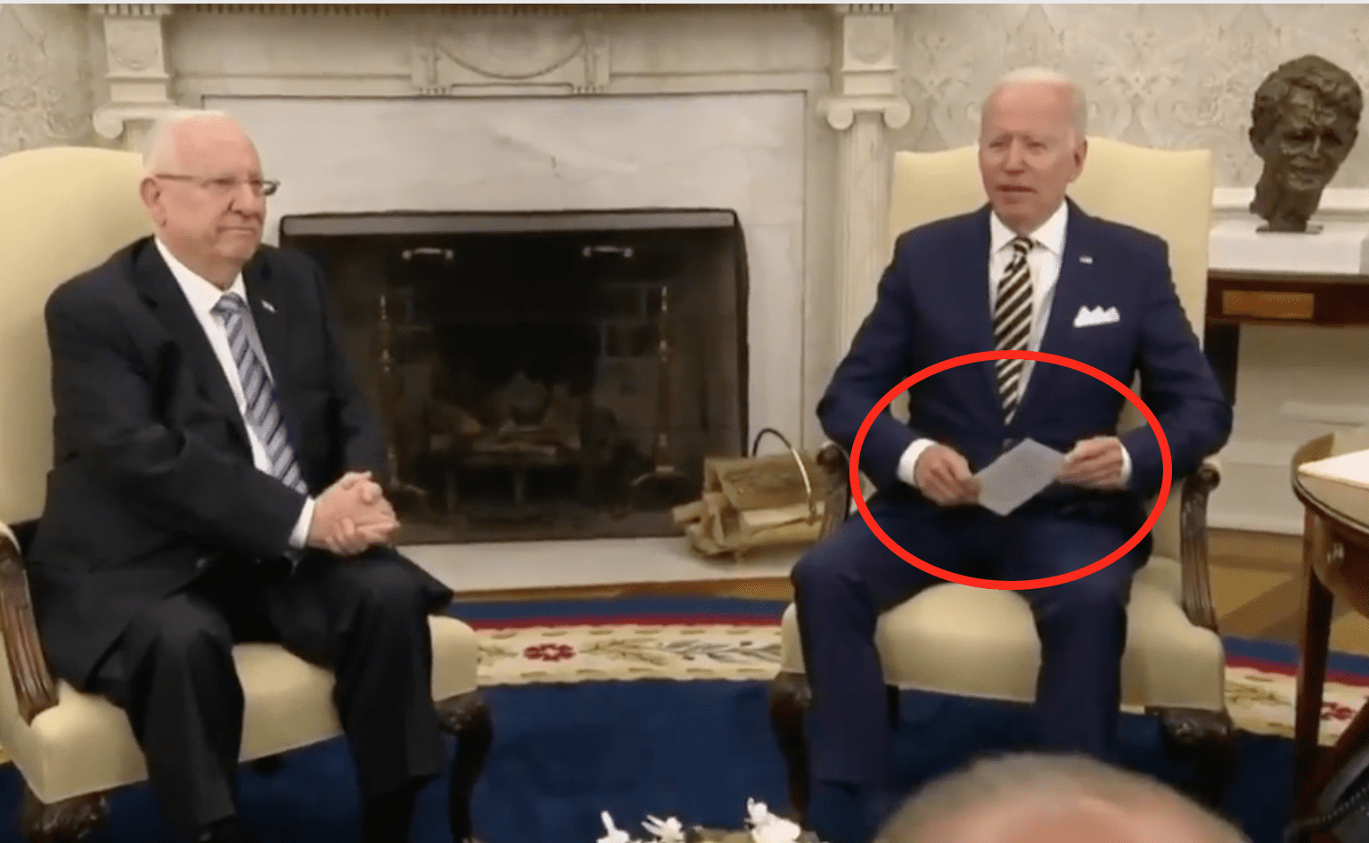 Today, instead of offering sincere support for Israel to President Reuben Rivlin who was visiting the White House, Joe Biden instead, kept his eyes fixed on notecards he held on his lap with prepared remarks.