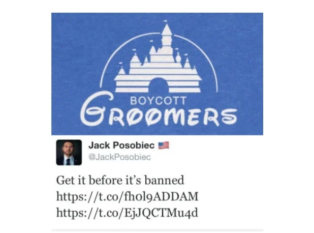 (Jim Hoft) Conservative Jack Posobiec was temporarily suspended from Twitter today after he shared links to buy T-shirts and stickers emblazoned with a Disney logo reading “Boycott Groomers.”