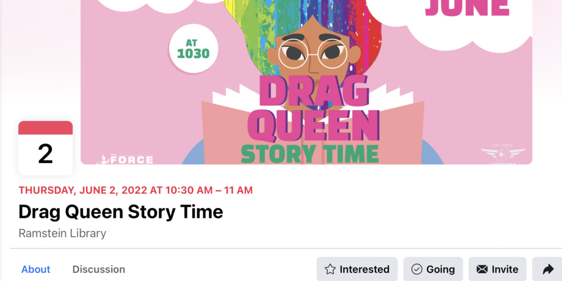 “We’re celebrating Pride Month at the Ramstein Library with Drag Queen Storytime! Join us with special guest reader Stacey Teed! Be sure to wear your brightest and most colorful outfits!,” says the Facebook event announcement, which was posted by the Ramstein & Vogelweh Air Force Libraries page. The promotional image for the event is featured below: