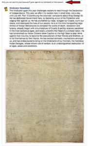 The post in question contained paragraphs 27 through 31 of the Declaration of Independence, the grievance section of the document wherein the put-upon colonists detail all the irreconcilable differences they have with King George III.