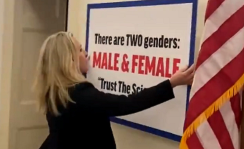 Rep. Marjorie Taylor Greene put a sign outside her office that says: "There are TWO genders: male & female. 'Trust the science!'"