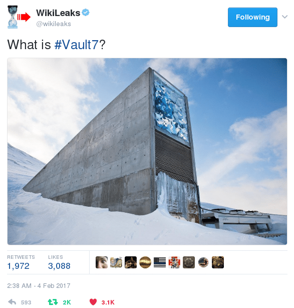 Vault 7 refers to the FBI data vault containing information about the 7th floor group Then why did Julian Assange show a picture of the actual Vault 7, which is a seed vault?
