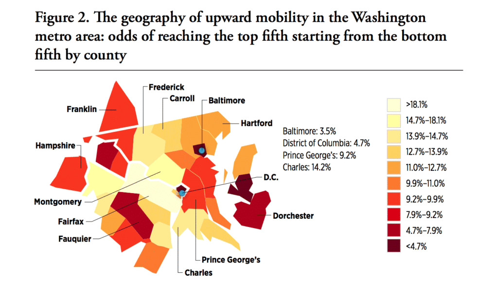 For the study, Chetty and colleagues analyzed economic mobility by U.S. county — and the resulting mapped data evinces pronounced disparities not only by region, but in several places, by counties in the same metro area.