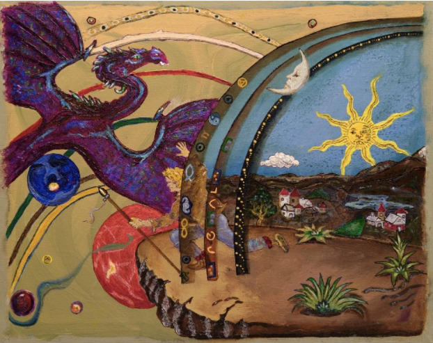 To experience our own Dragon Energy, Charlie and Ciruelo (the master painter of Dragons) created a drawing and then a painting that symbolically explains the Hero Journey and awakening into It. I (CW) painted it in oils here from page 7 of our Dragon Energy book.