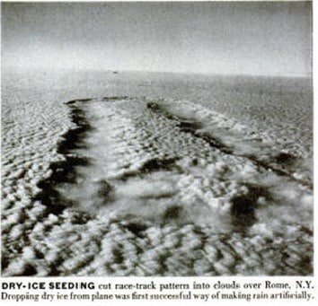 Weather scientists working for GE had figured out that dispersing particles of dry ice into super-cooled clouds will cause water crystals to form, serving as nuclei for rain drops, thereby causing rain to unnaturally fall. Part of Project Cirrus, the experiment involved GE employees Bernie Vonnegut, brother of the acclaimed American author Kurt Vonnegut, along with Nobel Prize winner Irving Langmuir and his assistant Vincent Schaefer, who were corroborating with top U.S. military brass in an effort to perfect the technique of cloud seeding.