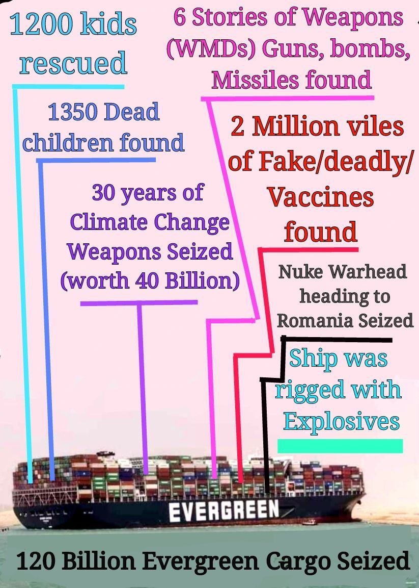 Also, look a the picture below to see what came from the Evergreen container ship when it got stuck on purpose in the Suez Canal and was later taken over and searched for several weeks at another location. The list includes children, weather modification equipment and nuclear warheads.
