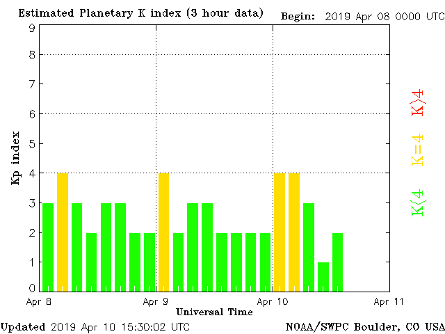 Geomagnetic activity is somewhat stable, ranging from 1 to 4 of the Kp Index. The solar wind intensity rose last night slightly, causing a minor uptick in geomagnetic activity. The geomagnetic field has stabilized, however. No major geomagnetic storms expected over the next 48 hours.