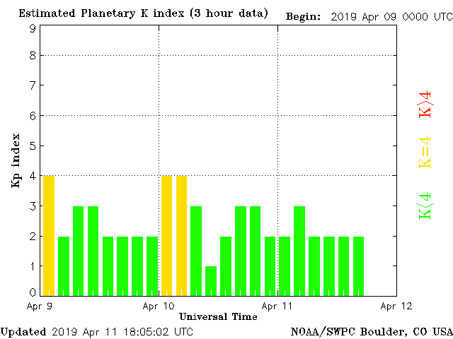 Geomagnetic activity is somewhat stable, ranging from 2 to 3 of the Kp Index. The solar wind intensity is trending down from the past days peek. No major geomagnetic storms expected over the next 48 hours.