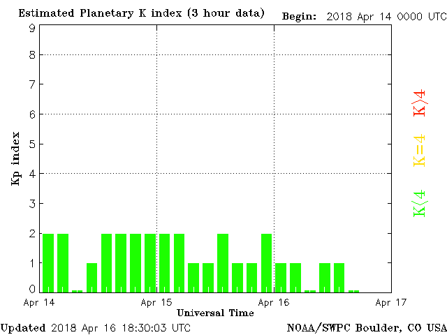 Geomagnetic activity is stable, ranging from 0 to 1 of the Kp Index. Solar wind intensity is calm. The next earth-facing coronal-hole is about to moving into position. The solar wind stream from that grouping will be less intense than the previous, and will impact the earth sometime mind week.