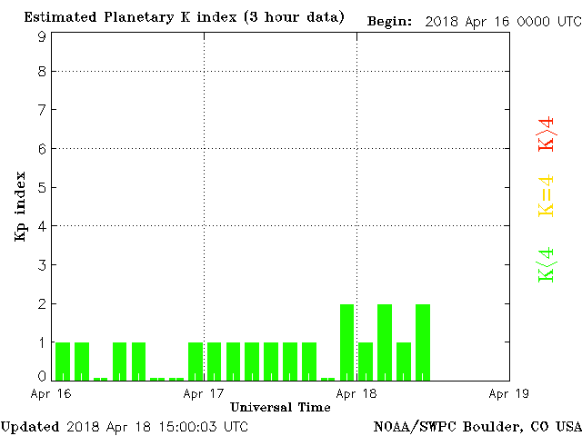Geomagnetic activity is a bit stable, ranging from 1 to 2 of the Kp Index. Solar wind intensity is calm. A minor B class solar event took place hours ago, in what appears to be the earth-facing direction, causing a minor uptick in geomagnetic activity. The earth-facing coronal-hole stream will likely begin impacting the earth tomorrow or the next day.