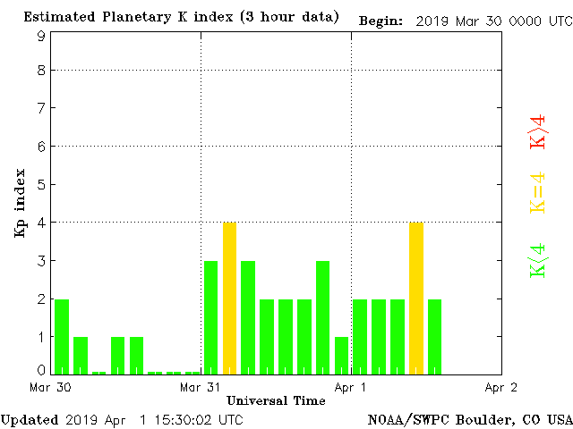 Geomagnetic activity is somewhat stable, ranging from 2 to 4 of the Kp Index. The solar wind intensity is calm. Another minor geomagnetic disturbance occurred this today, due to geomagnetic connections with the sun. The solar wind stream is weak but the geomagnetic field is oriented toward reception, causing the minor upticks we’ve seen over the past two days. Conditions are expected to remain calm despite these episodes of disquiet.