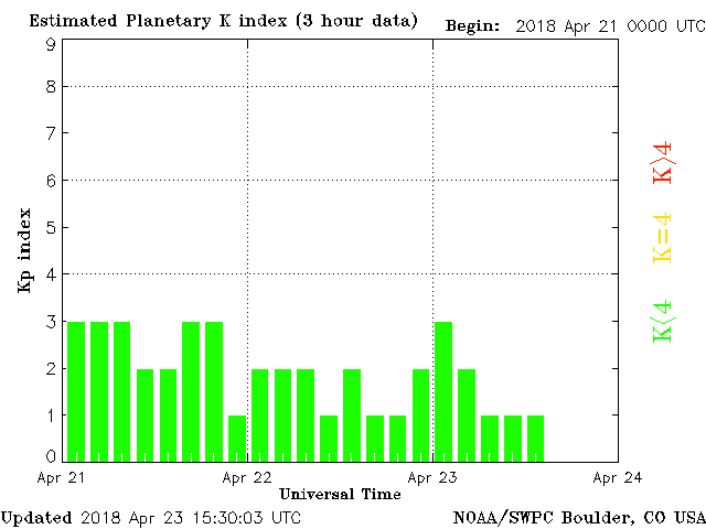 Geomagnetic activity is stabilizing, ranging from 1 to 2 of the Kp Index. Solar wind intensity is diminishing. The next earth-facing coronal-hole will begin interacting with the earth in several day.