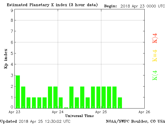 Geomagnetic activity is stabilizing, ranging from 1 to 2 of the Kp Index. Solar wind intensity is diminishing. The next earth-facing coronal-hole will begin interacting with the earth in 36 hours.