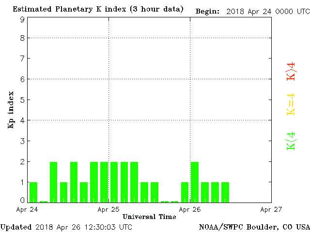 Geomagnetic activity is stabilizing, ranging from 1 to 2 of the Kp Index. Solar wind intensity is diminishing. The next earth-facing coronal-hole will begin interacting with the earth in 12 hours, after which, the geomagnetic field may experience minor disruptions.